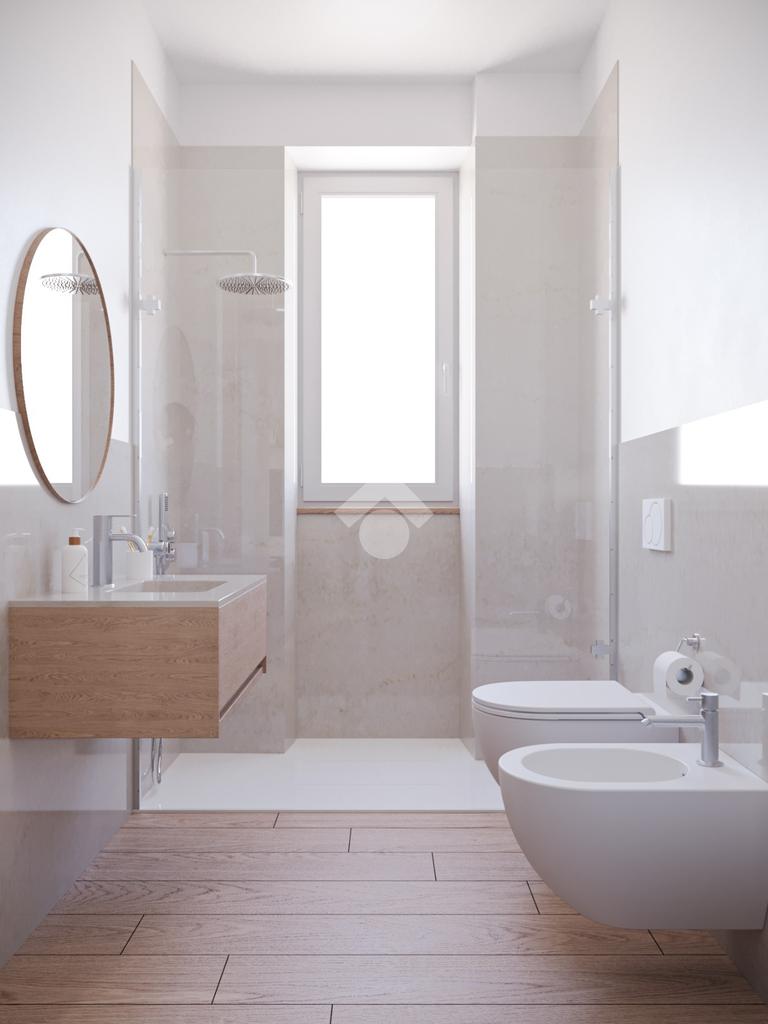 - bagno completo di sanitari, rubinetterie, piatto doccia con box e mobile sottolavabo sospeso.